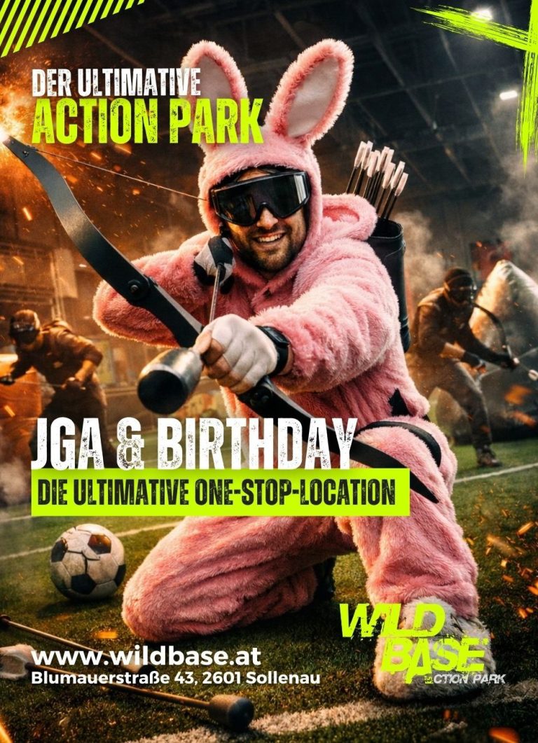 Im Wild Base-Action Park wird aus Feiern echtes Erleben: 15 actiongeladene Trend- & Funsportarten sorgen für Adrenalin, Teamspirit und maximalen Spaß – von Arrowtag, Paintball, Smash Room, Bubble Soccer bis Hide & Seek, Action Painting und vielen mehr.